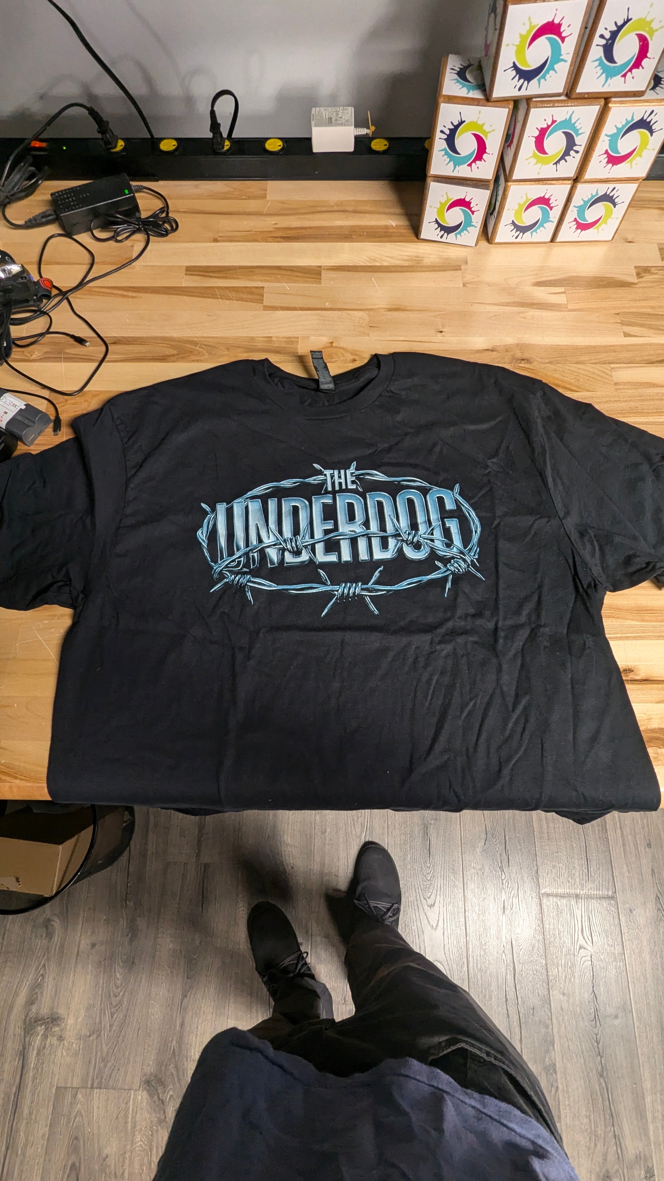 • Front: “THE UNDERDOG” in barbed-wire metallic blue