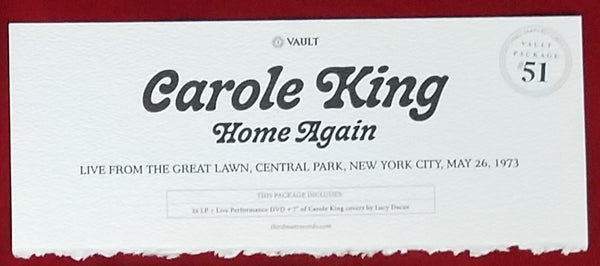 Title: Carole King - Home AgainAlbum cover artist: Lucy Dacus Location: New York, NYVenue: Central ParkNotes: Third Man RecordsVault Package #51 The package includes two LPs on brick-colored vinyl, with one side dedicated to a graphic etching of the Fantasy tour logo. The gatefold jacket and...