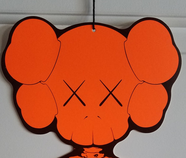 Title:  KAWS Skeleton Wall Hanging - Orange ColoredSize:  40" tallNotes:  One-sided Cardboard Wall Hanging.Printed on cardboard with movable arms and legs.