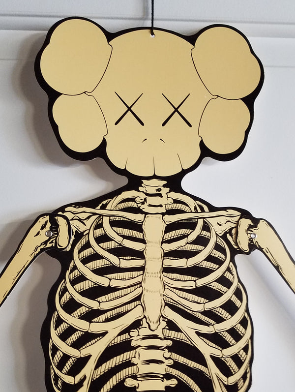 Title: KAWS Skeleton Wall Hangings - Set of 3Poster artist:  KawsSize: 40" tall each, colors are Bright Green, Bright Red and Bone.Notes: One-sided Cardboard Wall Hangings.Printed on cardboard with movable arms and legs.Green