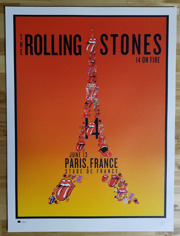 Title: Rolling Stones - 2014 OFFICIAL POSTER PARIS FRANCE Poster artist: Edition: xx/500 Type: Limited edition lithograph Size: 17" x 23" Location: Paris, France Venue: Stade De France Notes: 1st edition, official poster hand numbered and embossed. Official poster, Europe 14 On Fire...