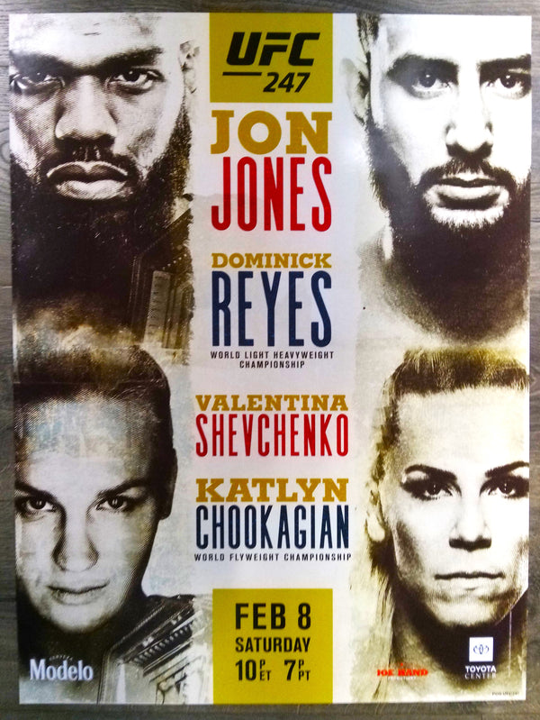 Title: UFC 247 Promotional Poster 2/8/2020 Jon Jones Dominick Reyes Type: Promotional Poster in Mint ConditionSize: 18" x 26"Location: Houston, TXVenue: Toyota CenterNotes: Promotional poster art for UFC 247, featuring Jon "Bones" Jones and Dominick Reyes. The card also featured Valentina Shevchenko and Katlyn...